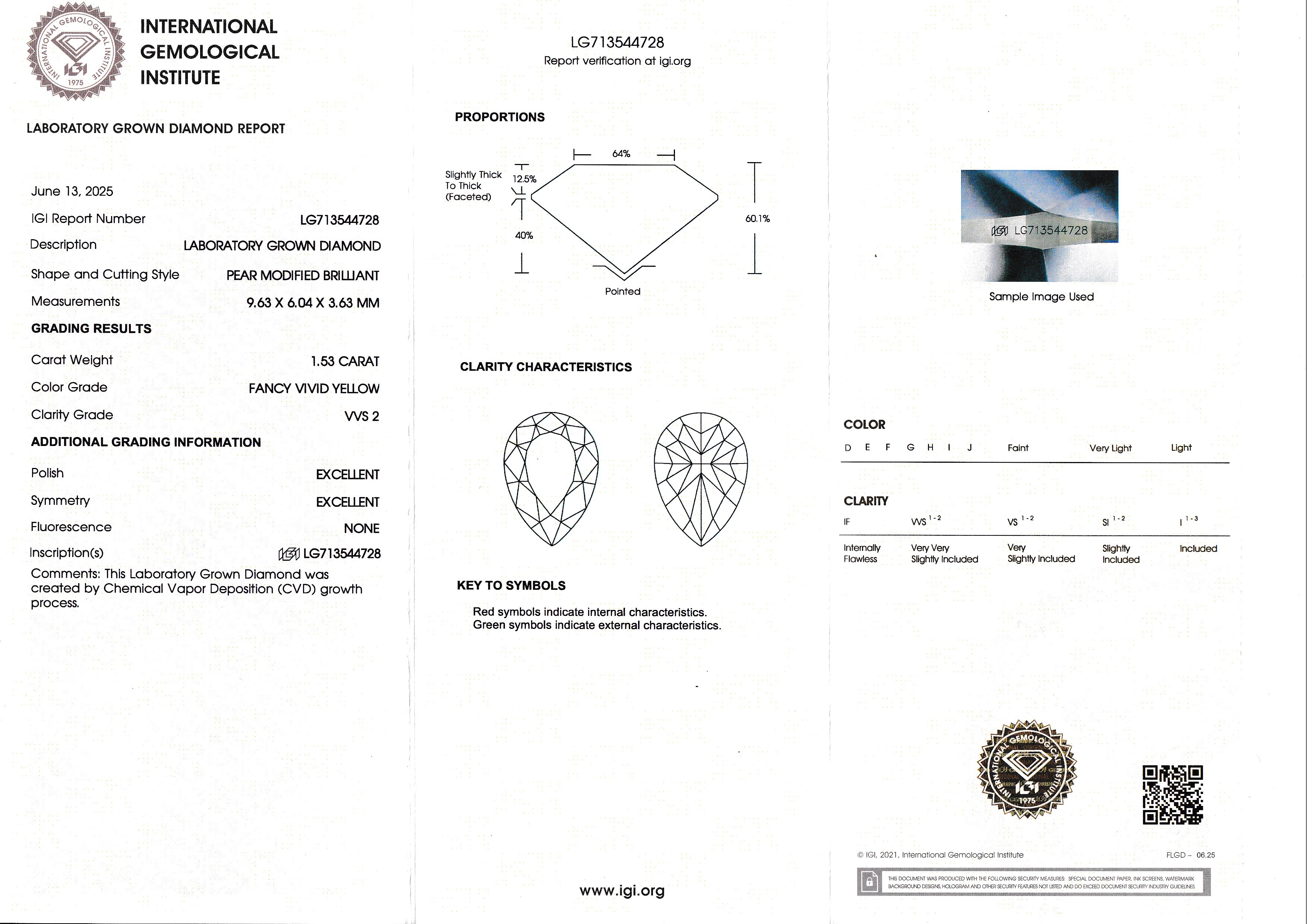 Лабораторно-выращенный бриллиант огранки "Груша" Fancy Vivid Yellow/VVS2 массой 1.53 ct