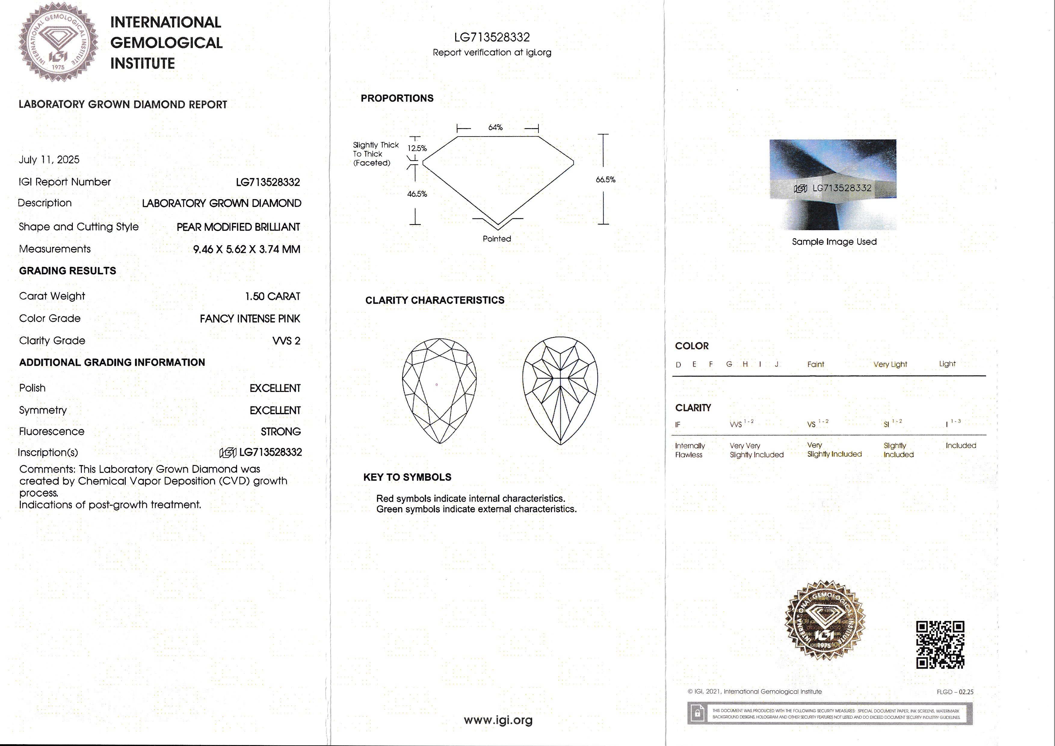 Лабораторно-выращенный бриллиант огранки "Груша" Fancy Intense Pink/VVS2 массой 1.5 ct