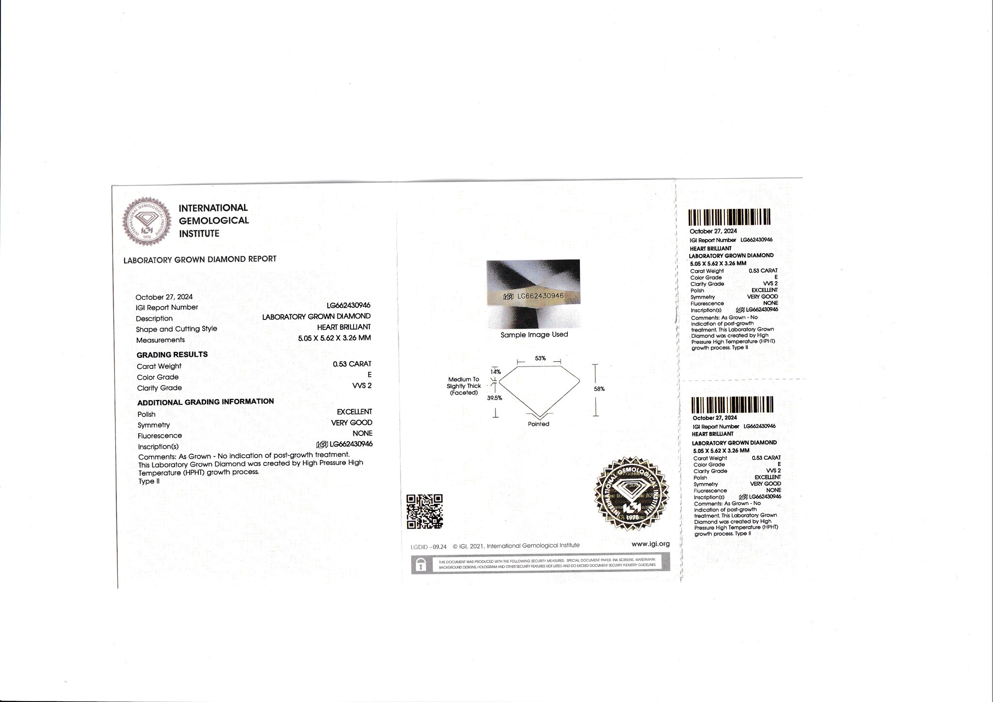 Лабораторно-выращенный бриллиант огранки "Сердце" E/VVS2 массой 0.53ct