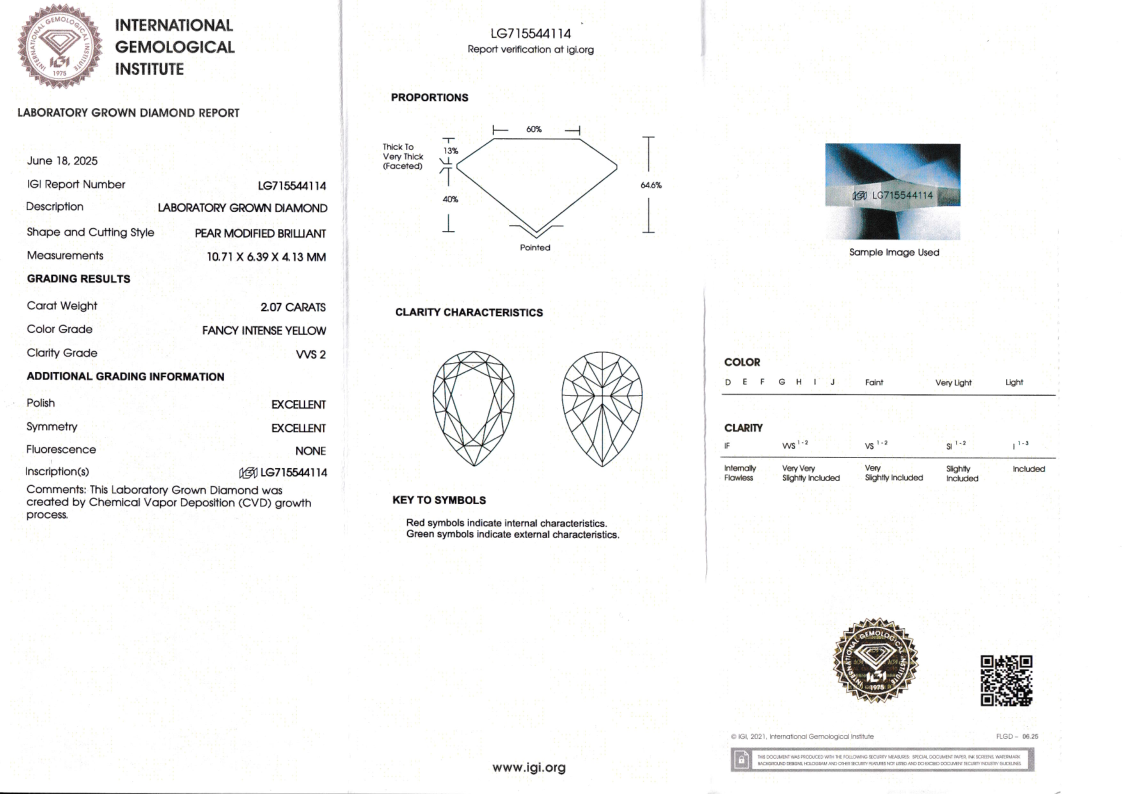 Лабораторно-выращенный бриллиант груша 10.71 х 6.39 х 4.13 мм Fancy INTENSE YELLOW/VVS2 2.07 ct