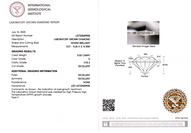 Лабораторно-выращенный бриллиант Кр-57 5.21-5.26 мм D/VVS2 0.52 ct