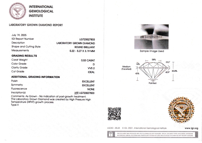 Лабораторно-выращенный бриллиант Кр-57 5.22-5.27 мм D/VVS2 0.53 ct