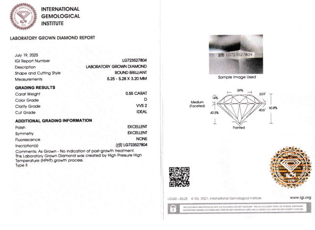 Лабораторно-выращенный бриллиант Кр-57 5.25-5.28 мм D/VVS2 0.55 ct