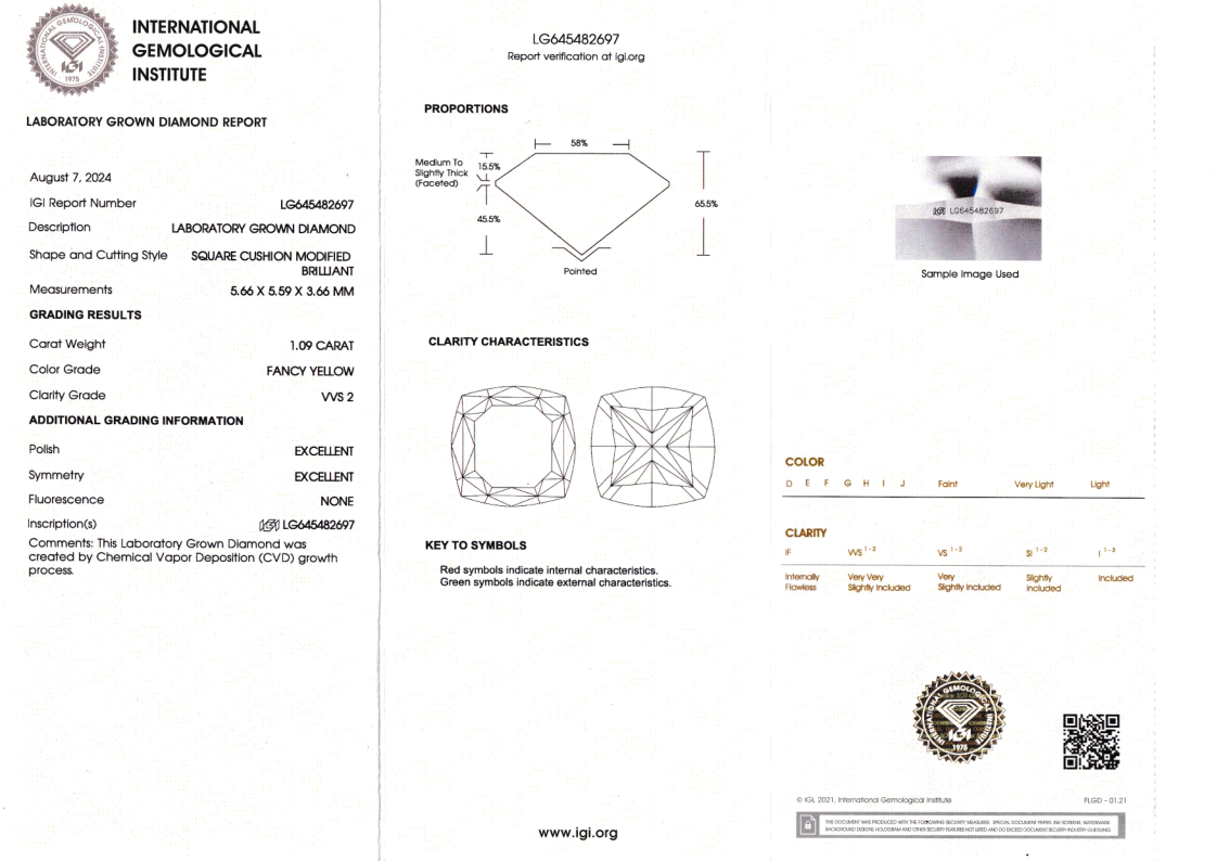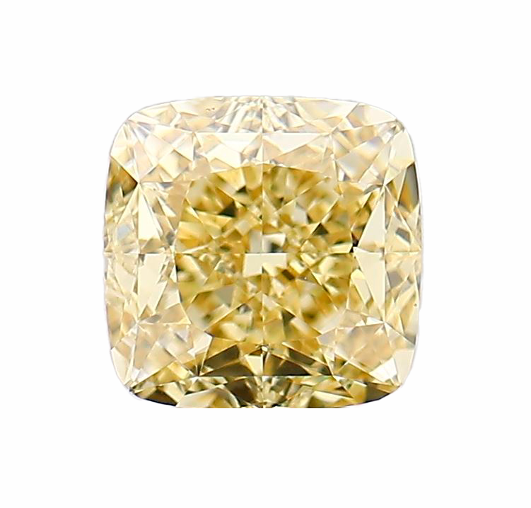 Лабораторно-выращенный бриллиант кушон 5.66 х 5.59 х 3.66 мм Fancy YELLOW/VVS2 1.09 ct