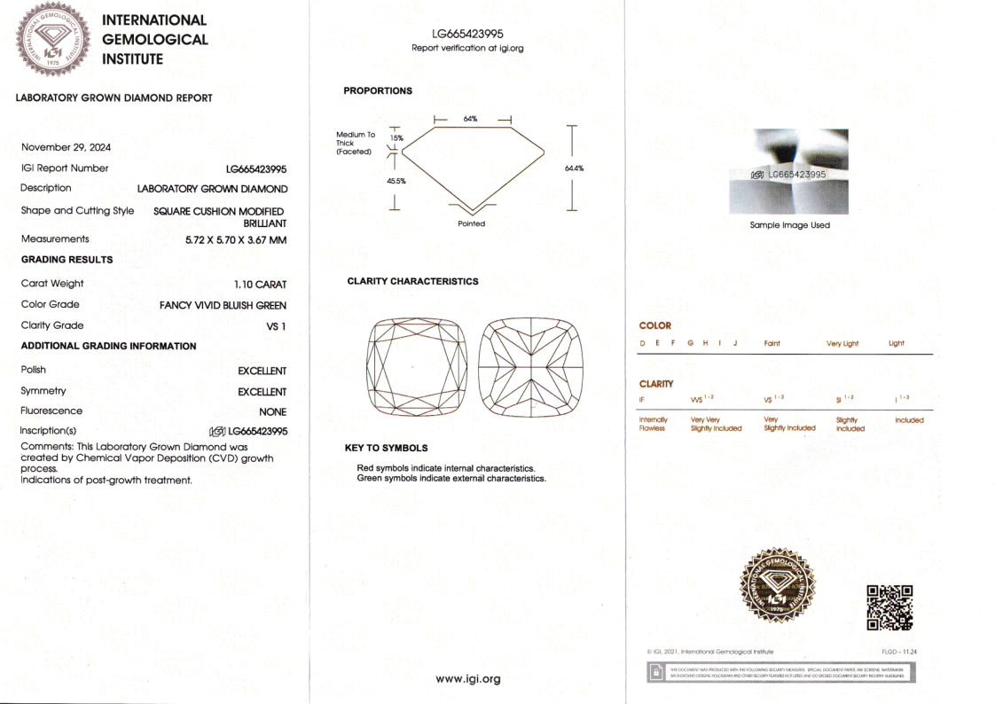 Лабораторно-выращенный бриллиант кушон 5.72 х 5.70 х 3.67 мм FancyVIVID BLUISH GREEN/VS1 1.10 ct