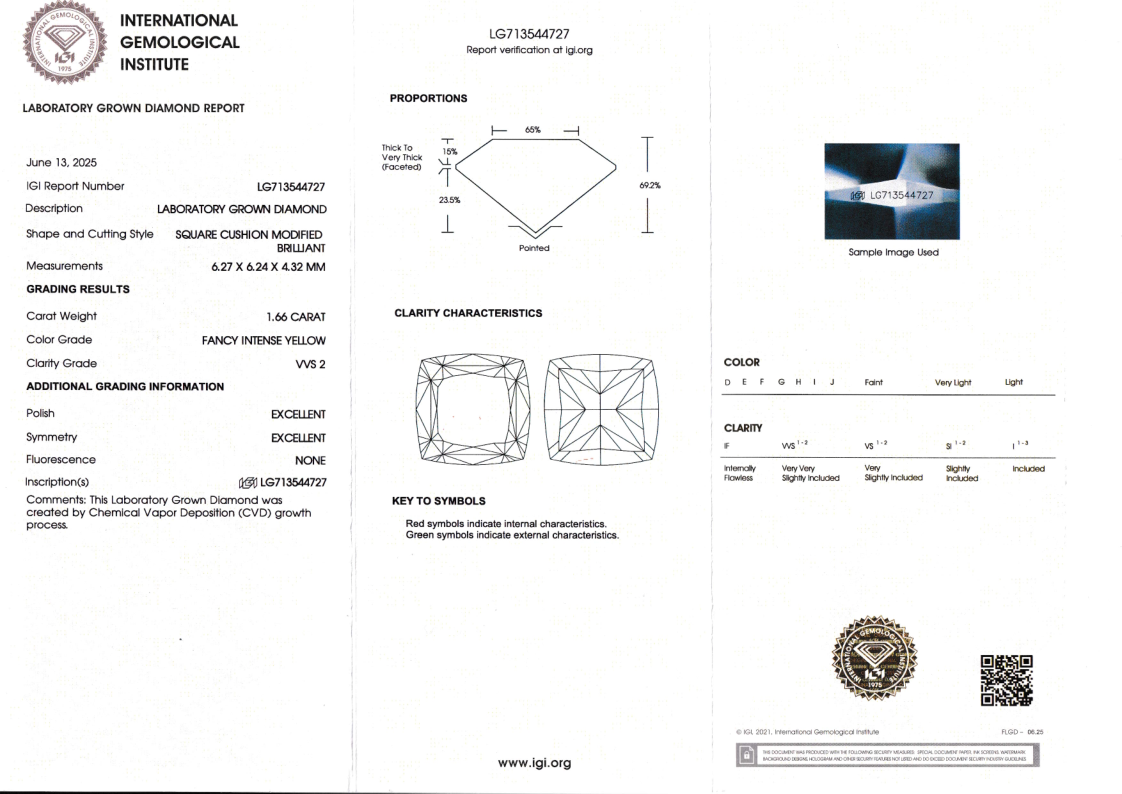 Лабораторно-выращенный бриллиант кушон 6.27 х 6.24 х 4.32 мм Fancy INTENSE YELLOW/VVS2 1.66 ct
