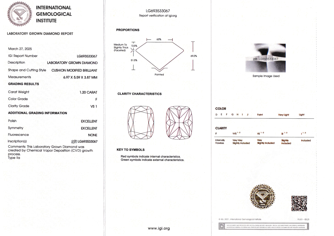 Лабораторно-выращенный бриллиант кушон 6.97 х 5.59 х 3.87 мм F/VS1 1.20 ct