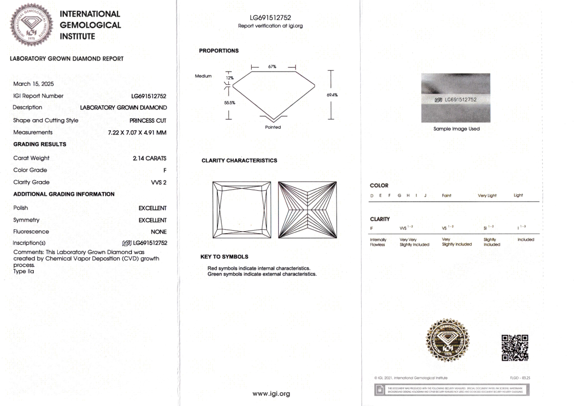 Лабораторно-выращенный бриллиант принцесса 7.22 х 7.07 х 4.91 мм F/VVS2 2.14 ct