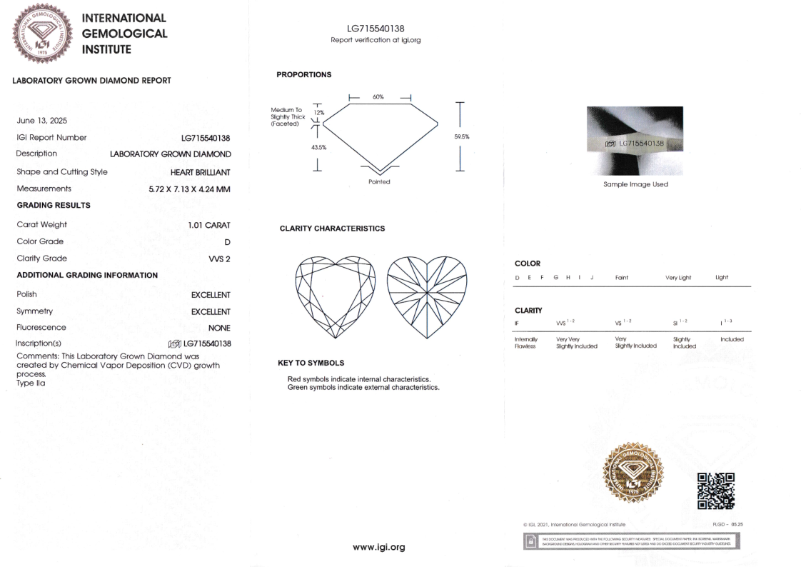 Лабораторно-выращенный бриллиант сердце 5.72 х 7.13 х 4.24 мм D/VVS2 1.01 ct