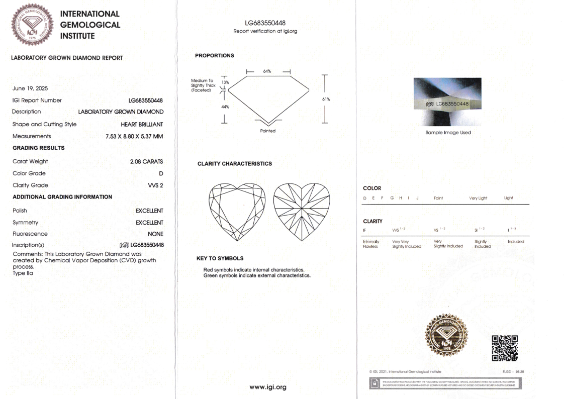 Лабораторно-выращенный бриллиант сердце 7.53 х 8.80 х 5.37 мм D/VVS2 2.08 ct